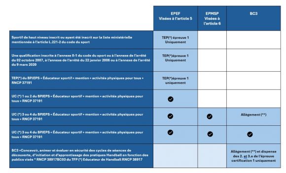 Le titulaire de l’une des certifications mentionnées dans la colonne de gauche du tableau figurant ci-après est dispensée du(es) test(s) technique(s) préalables à l’entrée en formation et/ou obtient les blocs de compétences (BC) correspondants du BPJEPS spécialité « éducateur sportif » mention « multi-activités physiques ou sportives pour tous », suivantes :