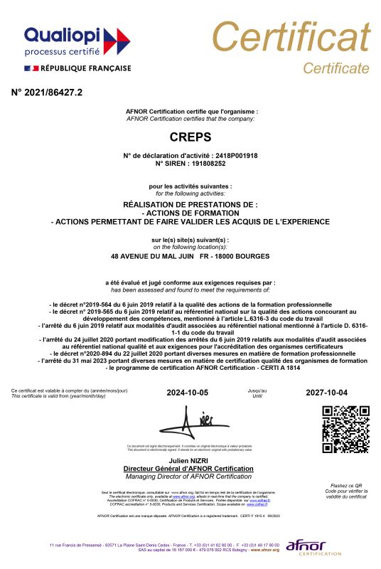 Le CREPS Centre-Val de Loire est certifié QUALIOPI, marque de garantie qualité en formation, depuis octobre 2021.
